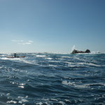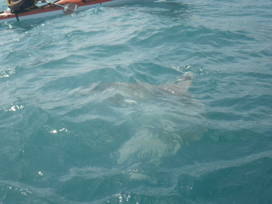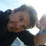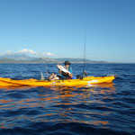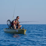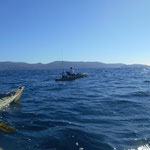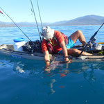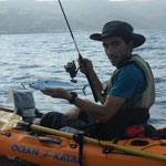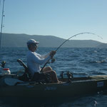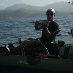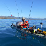 Sylvain nous rejoint et nous restons à coté de Tony qui gère....Le combat est superbe le bateau avance avec des pointes à 4 NDS c'est pas gagné cette histoire. 1 h plus tard la situation n'a guère évolué sauf que nous avons franchement dérivé et bien sur le vent se lève avec le reste de houle ça commence à être ambiance...1h30 de combat le poisson se rend doucement il reste a 40 mètres sous le Kayak il est monté une fois c'est un très gros poison et nous sommes de plus en plus loin.