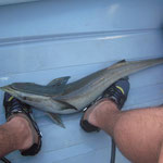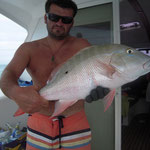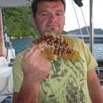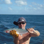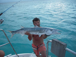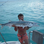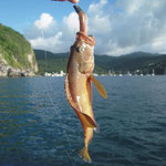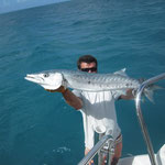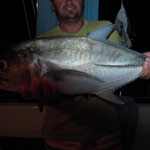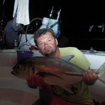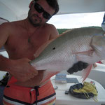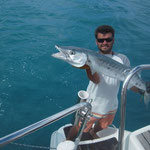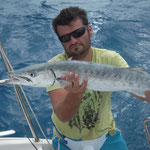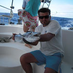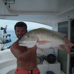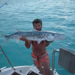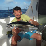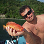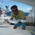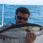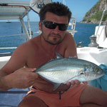 Salut a tous et mes meilleurs voeux pour cette année 2014. Je rentre à peine de guadeloupe aprés 3 semaines sur place avec ma petite famille.Nous avons été invités à passer ces 3 semaines par un couple d'amis qui eux sont partis 6 mois avec leur fils.... Merci encore à eux, se furent des vacances inoubliables, le deal était simple; mon pote n'avait jamais pêché et il voulait apprendre et bien il n' a pas été deçu et moi non plus. En revanche ce n'était a proprement parler pas un trip pêche car nous étions en famille et le but était avant tout de découvrir du pays et donc de naviguer, nous avons donc pêché à la traine principalement avec en plus beaucoup de vent et donc des vitesses de traine importantes ,de plus pas facile de stopper un catamaran de 15 métres lors des départs de canne et encore moins de sortir les poissons de l'eau avec une houle dépassant régulièrement les 2 mètres,c'était donc assez sport. Nous avons pris à la traine un nombre incalculable de thazards des thons,un Espadon qui sera malheusement décroché et quelques départs de malade que même mes plus fortes cannes n'ont pas réussi à contrer. Le soir entre 2 verres de rhum j'ai également initier mon pote au leurre souple: technique qui s'est rapidement avérée hyper efficace et ludique avec des combats de folie notamment avec la carangue que vous avez dans les photos et que j ai prise sur une canne de 7/23 g .Un grand moment avec la bobine de tresse totalement vidée à 2 reprises.... Enfin quelques belles sessions au poppers avec de superbes thazards qui nous ont mis des combats de folie avec de belles chandelles. Les enfants ont pêché aux leurres et au bouchon coulissant ce qui a permis à tous de découvrir une très belle diversité de poissons .Parmis les anedctotes aprés seulement quelques lancés Martial (le pote en question) a attrapé un Barracuda qui aurait pu etre son premier si lors du combat un autre n'était pas venu le devorer net je vous dis pas le téte du pecheur...(la photo de la téte du Barracuda est dans la galerie). Martial s'est aussi illustré avec un départ d'une violence terrible et 30 mn de combat pour se rendre compte qu'il s'agissait d'une tortue...que j'ai heureusement pu détacher sans dommage. Voila des moments de folie , des vacances magiques et un pécheur de plus ! en effet je crois que martial est accro il vient de m'appeler pour me dire qu'il vient de faire son premier thazard seul. Merci a toi mon poto je te souhaite un super trip avec plein de poissons.