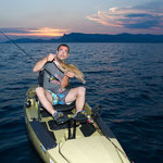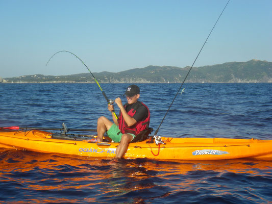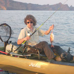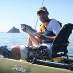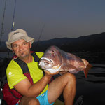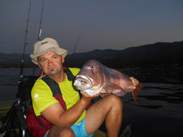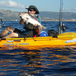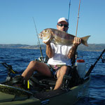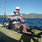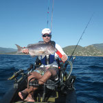 Bon c'est pas tout nous voila a 3 milles faut rentrer. En regardant le GPS je me rends compte que nous sommes à coté d'une jolie remontée que nous allons essayer de ce pas. Première descente pour Tony encore lui et Bing une châtaigne, cette fois c'est un beau denti qui remontera au kayak c'est cool. La soirée se terminera par 2 beaux poissons décrochés par tony et moi.