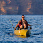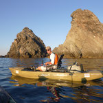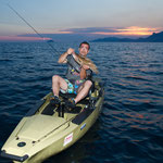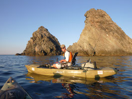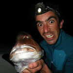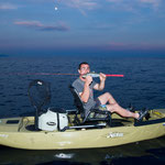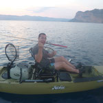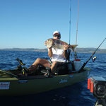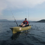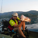 Après quelques 250000000 Kms, nous trouvons une baie qui parait très belle avec de beaux fonds. Allez c'est parti coup du soir on a juste le temps. Tony reste à terre grosse fatigue. J'en profite pour sortir avec le Pro Angler quel panard ce Kayak quand tu passes d'un bateau à l'autre tu te rends bien compte du confort et de l'efficacité de ce kayak.C'est donc en mode détente que j'aborde cette session;la mer est superbe le spot aussi et sur une dérive je prends une belle châtaigne, pendu un beau Denti plus gros que les précédents le top retour de nuit heureux...