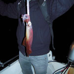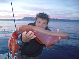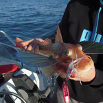 Nous mettons en traine un moment au vif avec un seul départ immédiatement décroché...le calmar remontera sans sa tête dommage.