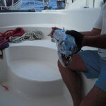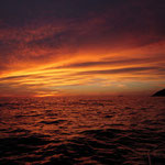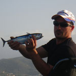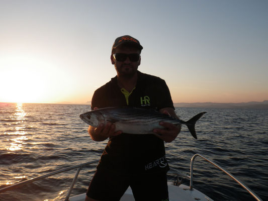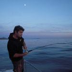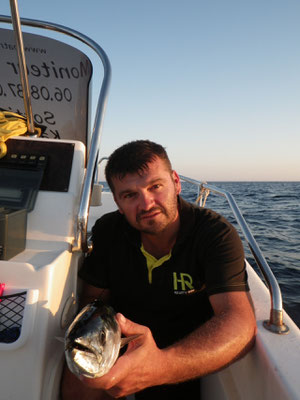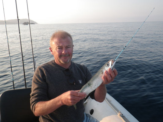 Donc petit coup du soir avec une mer magnifique et quelques poissons Barracuda, Sars et maquereaux mais rien de terrible, nous n'insistons pas trop. La navigation du matin laisse des traces.