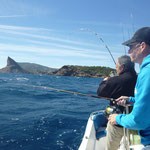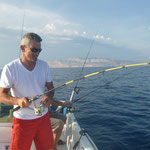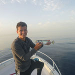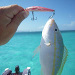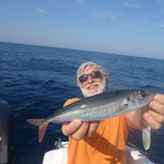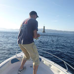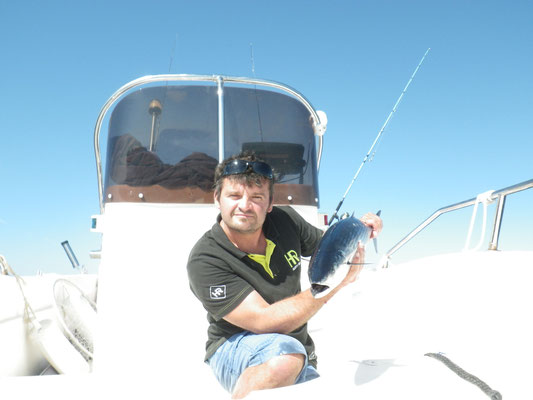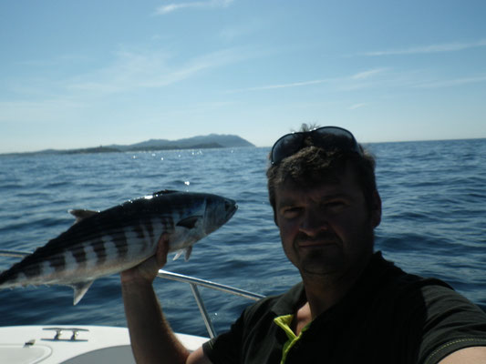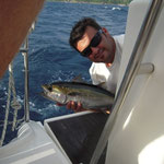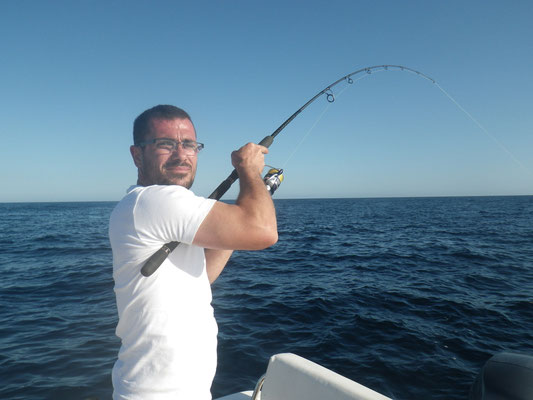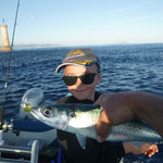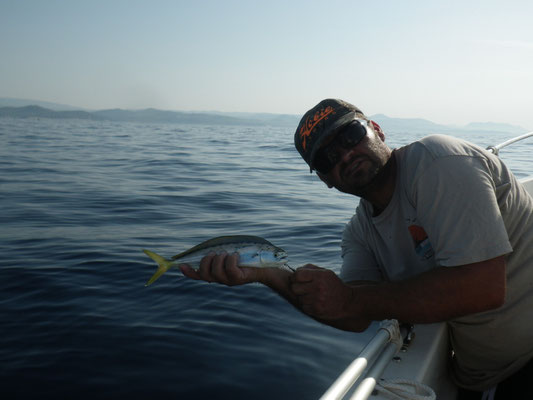 Arrivé en tête (alors il sait pas ramer le vieux hein Tony...),je lance en pensant tomber sur du gros et bien non ce sont des petites bonites avec lesquelles nous jouerons toute la matinée avec les cannes lights et en mode no Kill sur une mer magnifique(vidéos a suivre).
