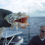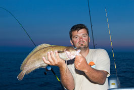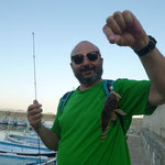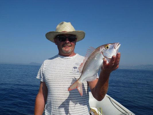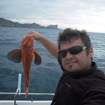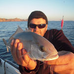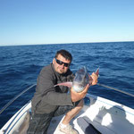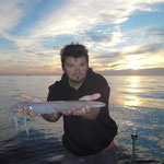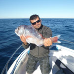 Direction le sud. Aprés les courses et la préparation des bateaux nous sommes à l'eau à 16 H et aprés 2 H de pêche c'est Sylvain qui ouvre le bal avec un beau Denti d'environ 5 kg. C'est son premier YYYESS bravo.Je touche finalement aussi un poisson du même format suivi de Tony. Ça part bien cette histoire.
