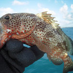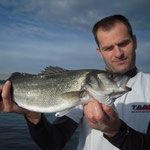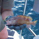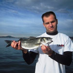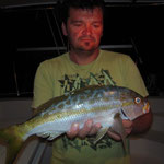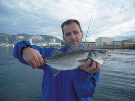 Devant le manque d'activité je décide de retourner prés du bord essayer de tirer notre épingle du jeu au leurre souple. Sur un petit spot je repére de l'activité en surface, vite montage d'un leurre, Xavier lance et Bing un joli loup magnifiquement mis au sec c'est son premier je suis trés content pour lui suivrons quelques serran écriture qui étaient franchement actifs...et toujours aussi beaux.