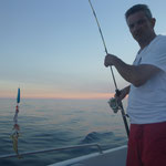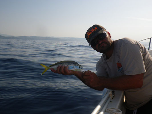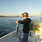 Ce matin une sortie en guidage avec Xavier qui revait d'attraper un premier beau poisson. Nous commençons par quelques calmars histoire d'avoir quelques vifs nous en ferons 5 en 30 minutes ça commence bien cette histoire. Nous partons ensuite au large , dans l'espoir de traquer les pélamides sur les chasses.L'activité n'est pas au rendez-vous,et nous ne verrons pas la moindre chasse.