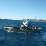 La houle est encore forte et ça frappe dure sur les rochers. Nous enchaînons les dérives sans succès en nous laissant aller dans des fonds de plus en plus important. C'est la que tout change, je repère de beaux, des très beaux échos à 100 mètres entre 2 eaux.Tony est le seul à pouvoir descendre à ces profondeurs car pour nous la dérive est trop fort lui arrive à faire du sur place en pédalant face au vent...Et bien sur première descente c'est le STRIKE un bon gros départ de malade, le moulinet hurle et le kayak part à donf, c'est un gros thon....Très gros.