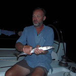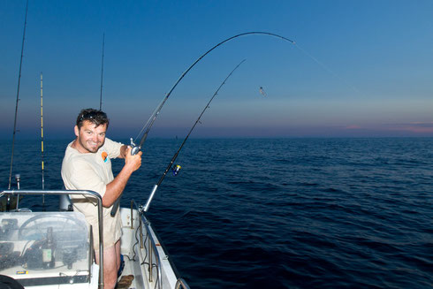 Debout 6 h. Sur l'eau de nuit, objectif toucher des Calamars et les mettre en vif sauf que avec une eau à presque 24° et bien les calmars on les cherche encore. C'est donc sans vif que nous pêchons avec les mêmes résultats que la veille avec en plus 2 poulpes.Le constat est mitigé il y a tout de même vraiment très peu pour ne pas dire aucune activité en surface c'est le désert...la faute à la température??